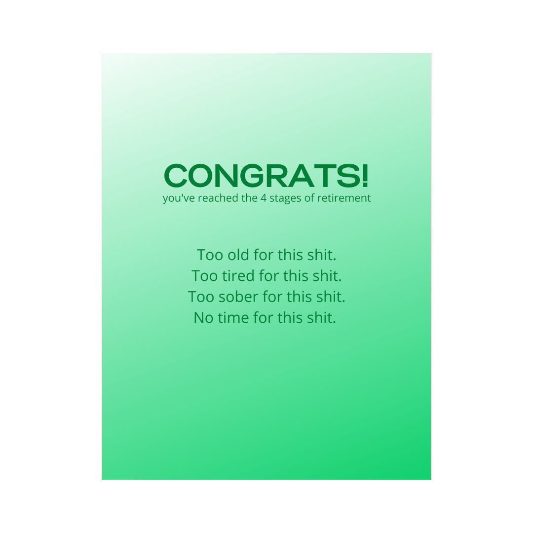 'Four Stages Of Retirement' is the perfect way to celebrate a retirement from work! Featuring a greeting card with four stages of retirement, the witty and sarcastic words will delight the recipient. From "too old for this shit" to "no time for this shit," this humorous card is sure to make your loved one smile!