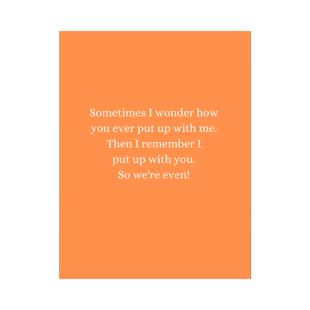 Unique and thoughtful, this greeting card is the perfect way to express how special your relationship is. Featuring the phrase, "sometimes I wonder how you ever put up with me, then I remember I put up with you, so we're even", it's sure to make your loved one smile! Personalize your message and make this card a funny, memorable token of your love.